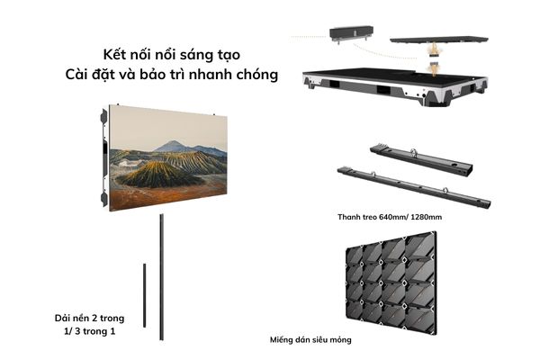 Đầu nối nổi cải tiến mới của Absen* thực hiện kết nối không cần cáp giữa mô-đun và bảng điều khiển, giúp việc lắp đặt và bảo trì thuận tiện và hiệu quả hơn. Dòng KL II hỗ trợ treo, treo tường và lắp đặt xếp chồng, v.v. Cung cấp thanh treo tiêu chuẩn, phụ kiện dải phía sau, miếng trang trí siêu mỏng để đáp ứng nhiều nhu cầu hơn của khách hàng. Hỗ trợ bảo trì trước mô-đun, nhận thẻ và hộp nguồn. Không cần xây dựng kênh bảo trì chuyên dụng, do đó tiết kiệm không gian lắp đặt.