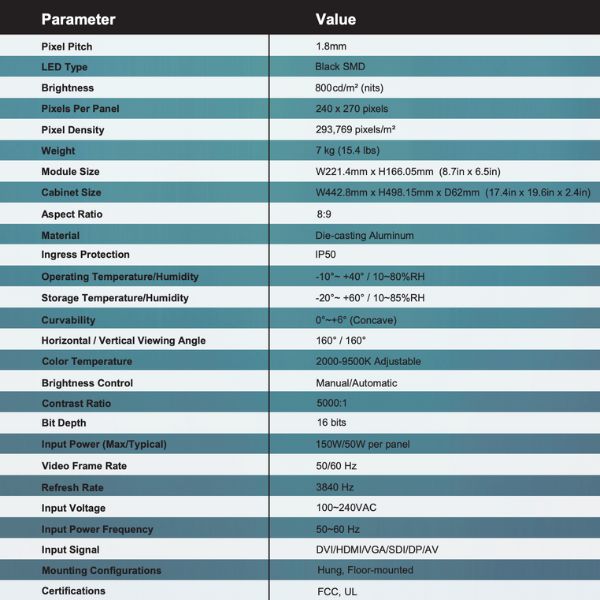 - THIẾT KẾ ĐƠN VỊ 8:9: Kết hợp các tủ để tạo tỷ lệ khung hình 16:9 ở độ phân giải LED 2K, 4K và 8K