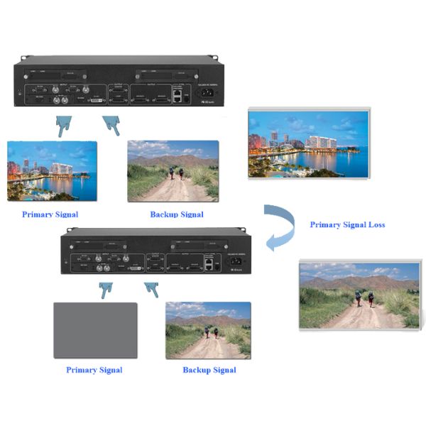 Người dùng có thể chỉ định tín hiệu dự phòng cho nguồn tín hiệu. Nếu tín hiệu hiện tại gặp sự cố, hệ thống sẽ tự động phát hiện và gọi tín hiệu dự phòng ngay lập tức. Và nếu tín hiệu trở lại bình thường, hệ thống sẽ chuyển ngược lại tín hiệu ban đầu một cách thông minh. Xây dựng hệ thống song song với chức năng này, độ tin cậy của cảnh có thể được đảm bảo hiệu quả.